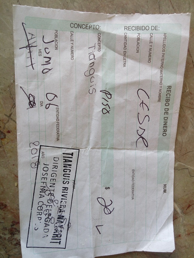 Entrevistado al respecto, el señor Cesar Granados vecino del fraccionamiento La Misión de San Vicente denunció, que al estar vendiendo en el tianguis, pasaron a cobrar cuota semanal por vender un solo día del cual dieron recibo reciclado, después pasó otra persona a cobrar cuota por la basura cuando se supone que ya era incluido.