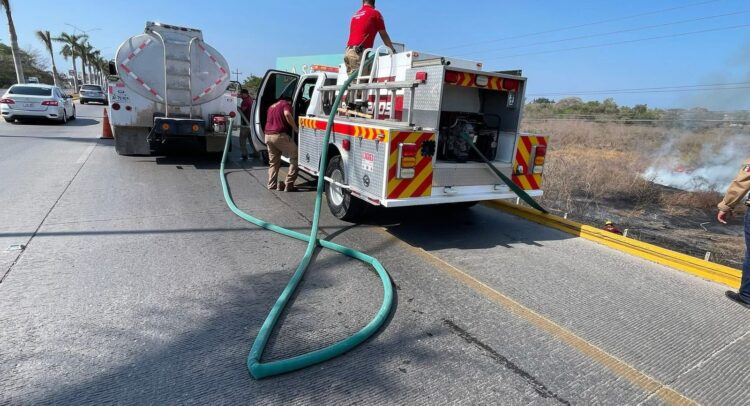 El reporte lo recibieron oficiales pasadas las 14:00 horas y de inmediato acudieron al mencionado punto donde confirmaron que el viento estaba jugando a favor del fuego por lo que sin perder tiempo pidieron el apoyo de dos unidades cargadas con agua y el apoyo de personal de la Policía Vial para restringir un carril y evitar algún accidente.
