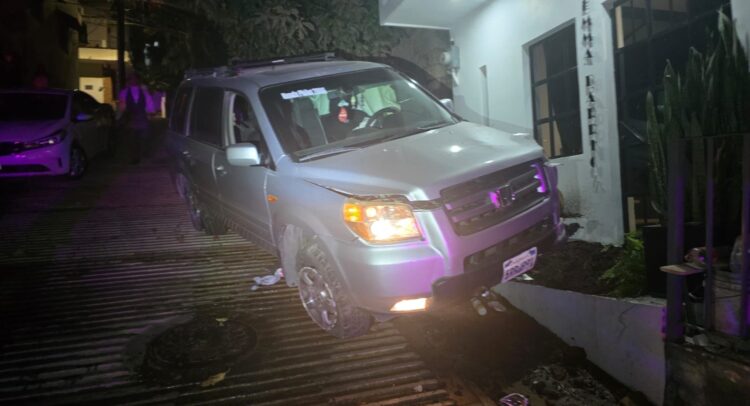 Los primeros oficiales en llegar confirmaron que se trataba de una camioneta de la marca Honda tipo Pilot, color gris la cual en efecto estaba chocado contra la fachada de un domicilio, sin embargo, al preguntar sobre el conductor el mismo ya no estaba en el lugar.