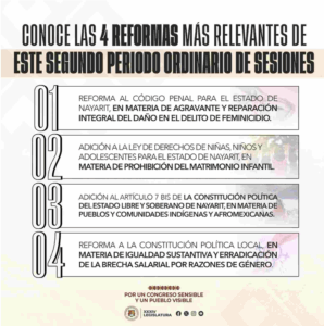 También, las y los diputados dieron su voto afirmativo a dos reformas de la Constitución del Estado de Nayarit para fortalecer los derechos de pueblos indígenas y afromexicanos, así como para garantizar la igualdad sustantiva, la perspectiva de género, el derecho de las mujeres a una vida libre de violencia y la eliminación de la brecha salarial.