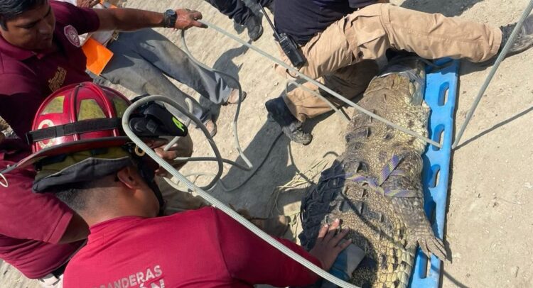 La tarde de este martes elementos de Protección Civil y Bomberos de Bahía de Banderas capturaron un cocodrilo de poco más de tres metros de largo en un pequeño estanque ubicado junto a la tienda Mega en Flamingos.
