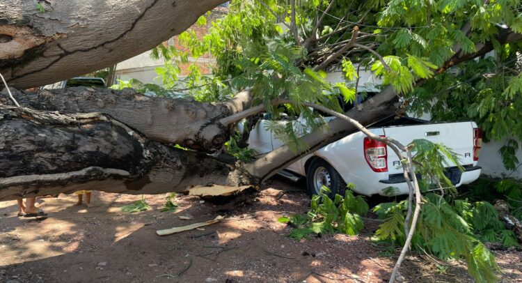 La falta de poda ocasionó que el pesó de las ramas le ganaran y colapsara cayendo sobre la camioneta