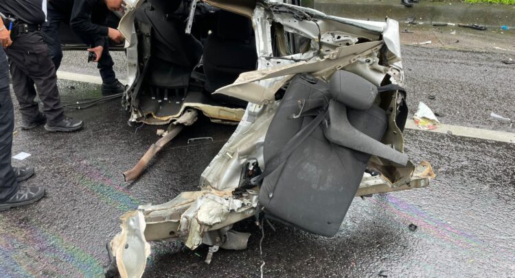 Tras el impacto, el Ford Fiesta salió proyectado contra una camioneta marca Ford, tipo Transit, color blanco, propiedad de Gobierno del Estado y finalmente hacia el acotamiento, dejando el vehículo partido en dos y las piezas regadas en el lugar. La cajuela y los asientos traseros del Fiesta quedaron desprendidos junto al paredón, afortunadamente viajaba sin ocupantes en esa sección del vehículo.