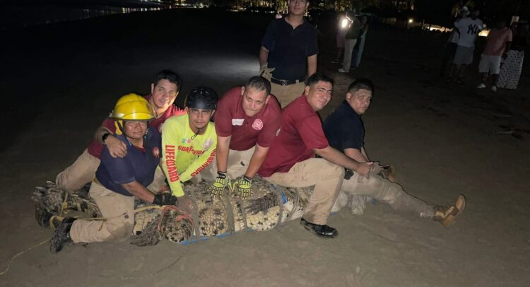 Tras mantenerlo en monitoreo permenente todo el día de ayer sábado, enorme cocodrilo fue capturado por la noche luego de que se reportara que se encontraba frente al hotel Villa Magna, en el área de playa.