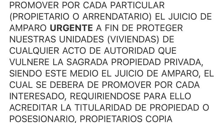 En días recientes, vecinos de Terralta recibieron un comunicado en el que se les solicita promover juicios de amparo urgentes para proteger sus viviendas ante posibles actos de autoridad que —afirman— vulneran su derecho a la propiedad. Para ello, se les pide presentar documentos como escrituras, contratos de arrendamiento y credenciales de identificación.