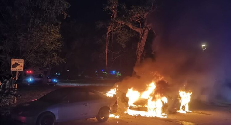 La madrugada de este sábado un coche que estaba estacionado a unos metros del módulo de policía en Fluvial Vallarta ardió en llamas de un momento a otro y el fuego alcanzó a dañar otro vehículo que estaba adelante.