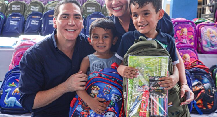 El presidente municipal de Bahía de Banderas, Héctor Santana García, acompañado de su esposa, Margui Zúñiga de Santana, presidenta del Sistema DIF Municipal, encabezaron la entrega de mochilas y útiles escolares en beneficio de niñas y niños de todo el municipio, con el objetivo de apoyar la economía familiar y motivar a los estudiantes en el próximo regreso a clases.
