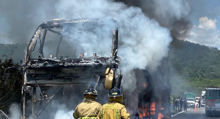 Jala, Nayarit; 12 de agosto de 2025.- La tarde de este martes, a través de la línea de emergencias 9-1-1, se recibió un reporte sobre un incendio de autobús registrado en el kilómetro 123 de la carretera Federal 15D Tepic – Guadalajara, en el municipio de Jala.
