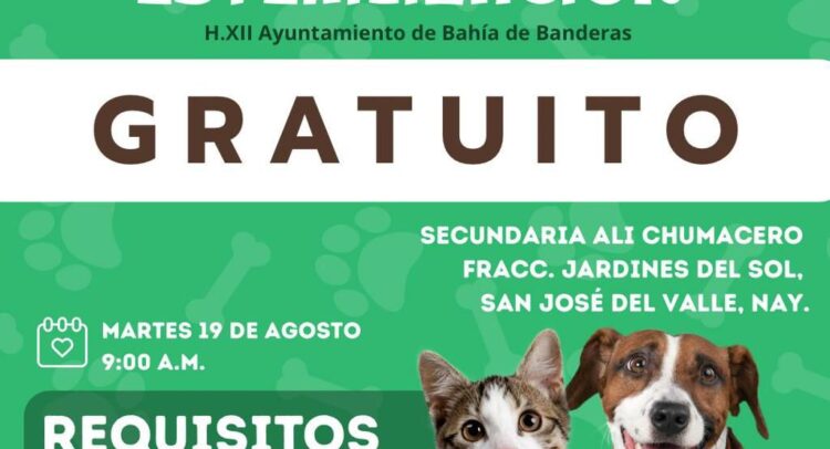 La Dirección de Medio Ambiente del H.XII Ayuntamiento de Bahía de Banderas, que encabeza el presidente municipal, Héctor Santana, invita a la ciudadanía a participar en la Campaña de Esterilización Gratuita, un esfuerzo para promover la salud y el bienestar animal en la región.