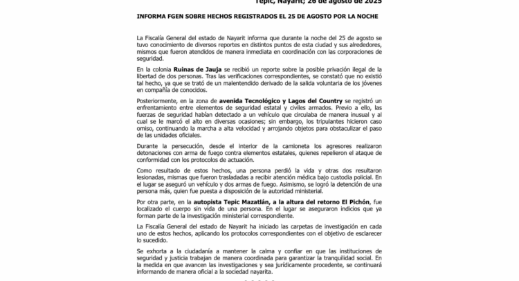 Tepic, Nayarit; 26 de agosto de 2025. — La Fiscalía General del Estado de Nayarit informó que la noche del 25 de agosto se registraron diversos hechos en distintos puntos de Tepic y sus alrededores, los cuales fueron atendidos en coordinación con corporaciones de seguridad.