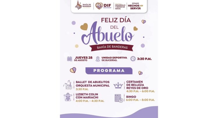 Este jueves 28 de agosto en punto de las 3:30 p.m., en la Unidad Deportiva de Bucerías, el Gobierno Municipal que encabeza Héctor Santana García y el DIF Bahía de Banderas, presidido por Margui Zuñiga, invitan a todas las familias a festejar juntos el Día del Abuelo.