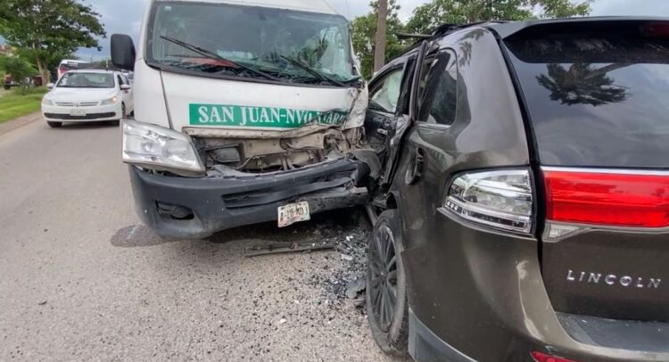 Siete personas lesionadas fue el resultado de un fuerte choque entre una camioneta y un taxi colectivo la tarde de este domingo en la carretera que lleva de San José a Jardines del Sol.