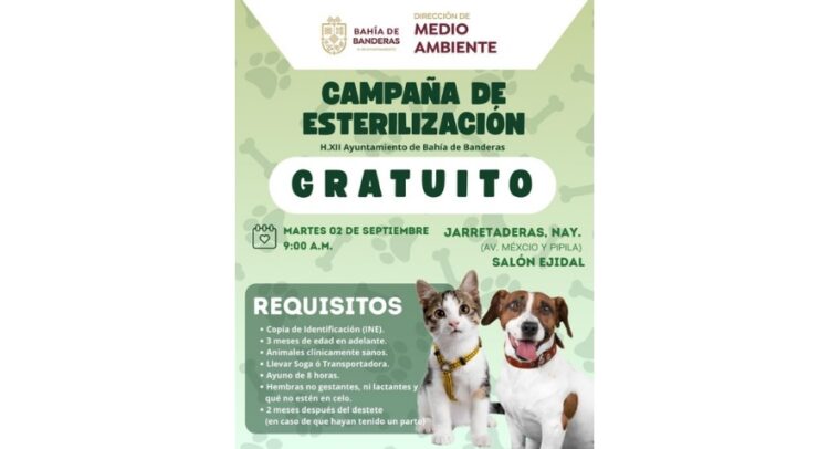 El Ayuntamiento de Bahía de Banderas invita a la comunidad a participar en la campaña gratuita de esterilización de perros y gatos, este próximo martes 2 de septiembre a las 9:00 a.m. en el Salón Ejidal de Jarretaderas.