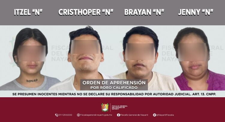 La Fiscalía General del estado de Nayarit informa que elementos de la Agencia de Investigación Criminal ejecutaron una orden de aprehensión en la ciudad de Tepic contra Cristhoper Aarón “N”, Brayan Antonio “N”, Itzel Yoselin “N” y Jenny Fernanda “N”, por su probable participación en hechos que la ley tipifica como delito de robo calificado, cometido en perjuicio de Comercial Dportenis, S. A. de C. V.