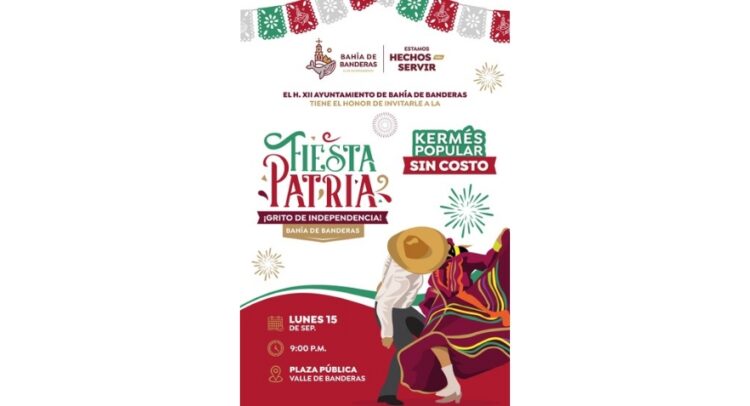 El H. XII Ayuntamiento de Bahía de Banderas, encabezado por el presidente municipal Héctor Santana, invita a todas la ciudadanía a disfrutar de la gran Fiesta Patria y Kermés Popular gratuita con motivo de la celebración del 15 de Septiembre, que tendrá lugar en la Plaza Pública de Valle de Banderas.