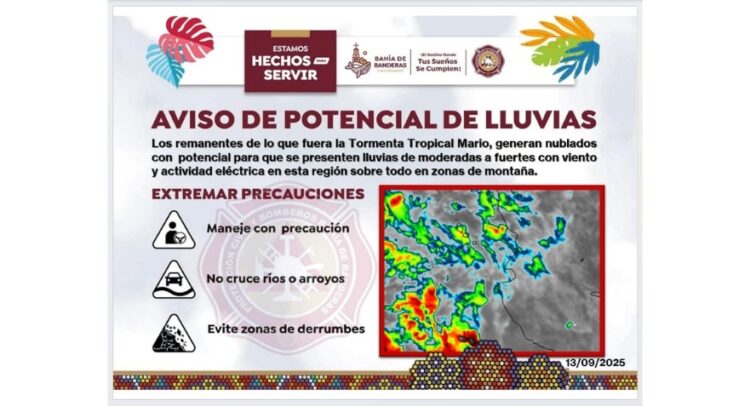 El Gobierno Municipal, a través de la Dirección de Protección Civil y Bomberos emitieron un aviso preventivo debido a la presencia de nubosidad generada por los remanentes de la Tormenta Tropical Mario, lo que podría ocasionar lluvias de moderadas a fuertes acompañadas de viento y actividad eléctrica en la región.