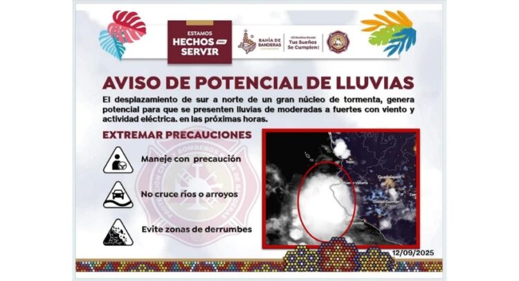 Bahía de Banderas, Nayarit; 11 de septiembre de 2025.– El Gobierno Municipal de Bahía de Banderas, encabezado por el presidente Héctor Santana, a través de la Dirección de Protección Civil y Bomberos, informó sobre el avance de un gran núcleo de tormenta que se desplaza de sur a norte, el cual podría provocar lluvias de moderadas a fuertes, acompañadas de vientos y actividad eléctrica en las próximas horas.