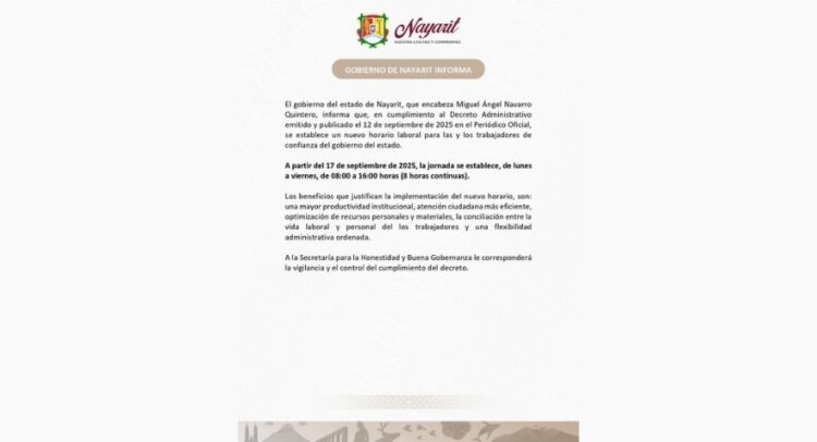 Tepic, Nayarit,13 de septiembre de 2025.- El gobierno del estado de Nayarit, que encabeza Miguel Ángel Navarro Quintero informa que, en cumplimiento al Decreto Administrativo emitido y publicado el 12 de septiembre de 2025 en el Periódico Oficial, se establece un nuevo horario laboral para las y los trabajadores de confianza del gobierno del estado.