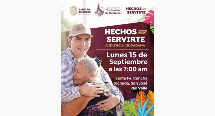 El H. XII Ayuntamiento de Bahía de Banderas, encabezado por el presidente municipal Héctor Santana, invita a la población a participar en la próxima Audiencia Ciudadana que se realizará este lunes 15 de septiembre en punto de las 7:00 de la mañana en la cancha techada de Santa Fe, en San José del Valle.