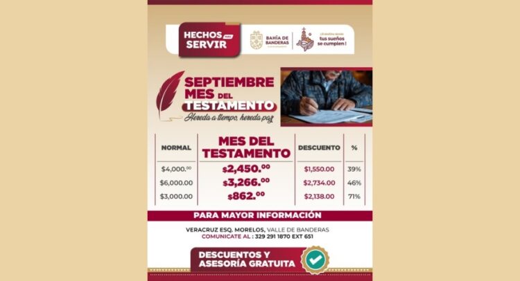 El H. XII Ayuntamiento de Bahía de Banderas, el cual encabeza el presidente municipal, Lic. Héctor Santana, ha lanzado la campaña «Septiembre, Mes del Testamento», ofreciendo descuentos significativos para facilitar a los ciudadanos la elaboración de este documento.
