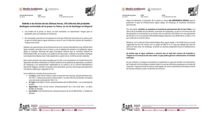 ➢ Los niveles de la presa La Yesca, en este momento, no representan riesgos para la población, pero se mantiene el monitoreo.