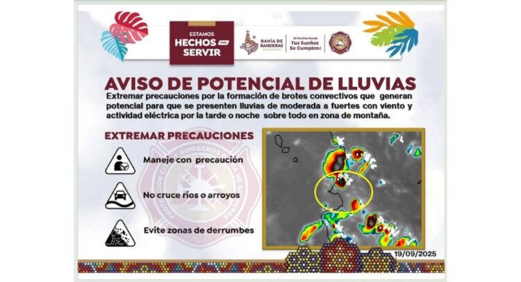 El H. XII Ayuntamiento de Bahía de Banderas, que encabeza el presidente municipal Héctor Santana, a través de la Dirección de Protección Civil y Bomberos, emitió un aviso preventivo ante la formación de brotes convectivos, los cuales generan potencial para que se presenten lluvias de moderadas a fuertes con viento y actividad eléctrica, principalmente durante la tarde y noche, y con mayor incidencia en zonas de montaña.