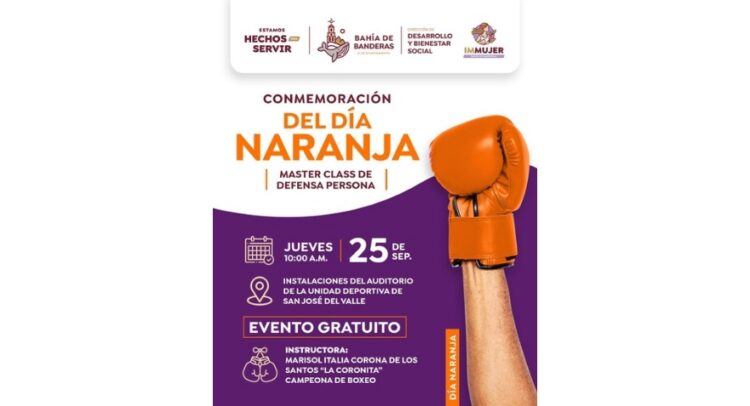 En conmemoración del Día Naranja, el H. XII Ayuntamiento de Bahía de Banderas, a través de la Dirección de Desarrollo y Bienestar Social y el IMMUJER, realizará una Master Class de Defensa Personal en el auditorio de la Unidad Deportiva de San José del Valle.