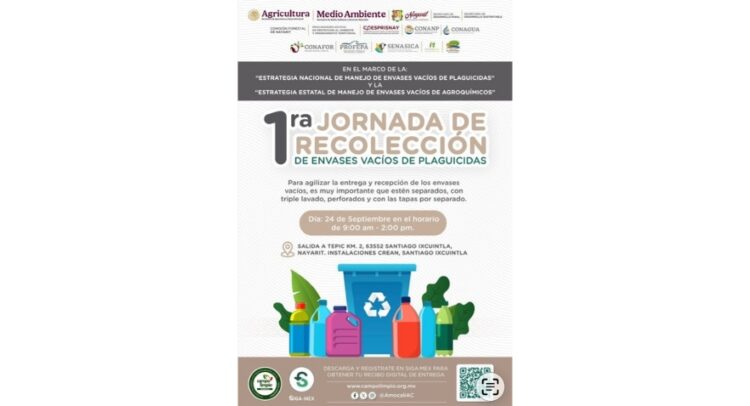 El gobierno del estado de Nayarit, en coordinación con instituciones federales y estatales, invita a la 1ª Jornada de Recolección de Envases Vacíos de Plaguicidas, que se llevará a cabo este 24 de septiembre de 9:00 a.m. a 2:00 p.m. en las instalaciones del CREAN, Santiago Ixcuintla.