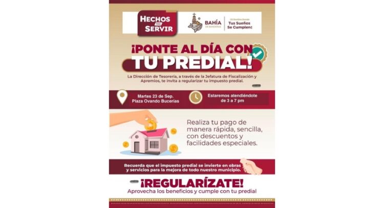 El Gobierno Municipal de Bahía de Banderas, a través de la Dirección de Tesorería y la Jefatura de Fiscalización y Apremios, invita a la ciudadanía a aprovechar las jornadas especiales de regularización del impuesto predial.