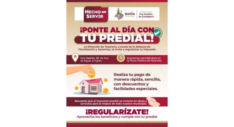 Bahía de Banderas, Nay., 24 de septiembre de 2025.- El Gobierno Municipal, a través de la Dirección de Tesorería y la Jefatura de Fiscalización y Apremios, anunció que este jueves 25 de septiembre se llevará a cabo una Jornada de Regularización del Predial en la Plaza Pública de Mezcales, en un horario de 3:00 a 7:00 de la tarde.