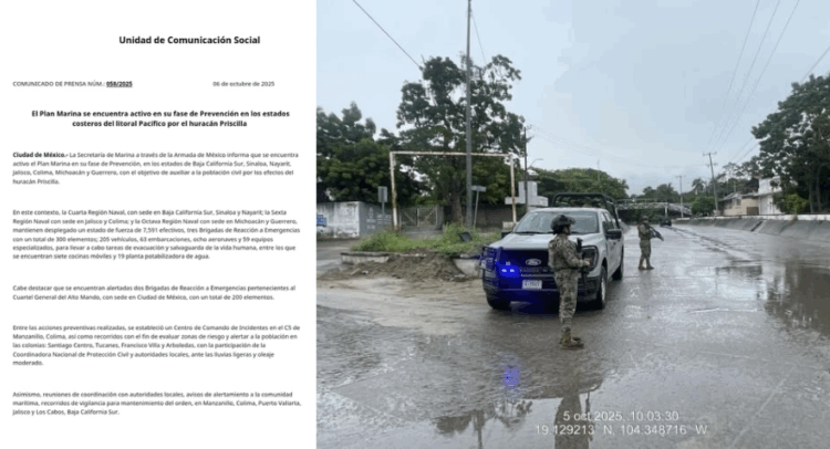 La Secretaría de Marina, a través de la Armada de México, informó que mantiene activo el Plan Marina en su fase de Prevención ante la presencia del huracán “Priscilla”, en los estados de Baja California Sur, Sinaloa, Nayarit, Jalisco, Colima, Michoacán y Guerrero, con el propósito de proteger a la población civil y mitigar riesgos.