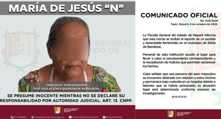 La Fiscalía General del Estado de Nayarit informó que elementos de la Agencia de Investigación Criminal ejecutaron una orden de aprehensión en la ciudad de Tepic en contra de María de Jesús “N”, por su probable participación en el delito de violación equiparada agravada, en agravio de un menor de edad cuya identidad se mantiene bajo reserva por respeto a su privacidad e integridad.