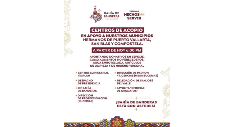 Ante las afectaciones ocasionadas por las intensas lluvias registradas el pasado sábado 11 de octubre en el municipio de Puerto Vallarta, San Blas y Compostela, el Gobierno de Bahía de Banderas, que encabeza el presidente municipal Héctor Santana, convoca a la ciudadanía y a las dependencias municipales a sumarse con espíritu solidario a una campaña de acopio de víveres y donativos en especie en apoyo a las familias vallartenses.