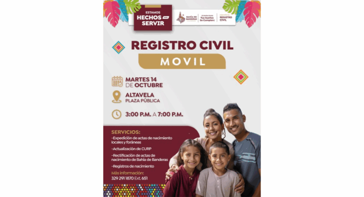 El Gobierno de Bahía de Banderas, que encabeza el presidente municipal Héctor Santana, a través de la Dirección de Registro Civil, anunció que el módulo móvil estará en la plaza pública de Altavela este próximo martes 14 de octubre, con horario de atención de 3:00 p.m. a 7:00 p.m.