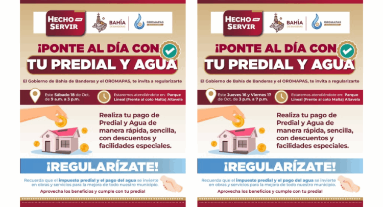El Gobierno de Bahía de Banderas y el Organismo Operador Municipal de Agua Potable, Alcantarillado y Saneamiento (OROMAPAS) continúan invitando a la ciudadanía a regularizar sus pagos del impuesto predial y del servicio de agua potable.