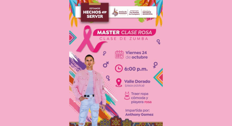 El Gobierno de Bahía de Banderas, a través de la Dirección de Deporte, extiende la invitación para sumarse a la “Master Clase Rosa” de Zumba, un evento que estará lleno de energía y buena vibra, mismo que se realizará este próximo viernes 24 de octubre en punto de las 6:00 p.m. en la plaza pública de Valle Dorado.