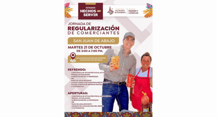 PEl Gobierno Municipal de Bahía de Banderas, que encabeza el presidente municipal Héctor Santana, a través de la Dirección de Padrón y Licencias, realizará una Jornada de Regularización de Comerciantes este próximo martes en un horario de 3pm a 7pm, en las instalaciones del Registro Civil de San Juan de Abajo.