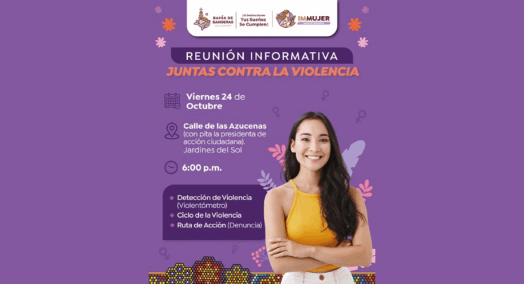 El H. XII Ayuntamiento de Bahía de Banderas, a través del Instituto Municipal de la Mujer, invita a la ciudadanía a participar en la Reunión Informativa titulada «Juntas Contra la Violencia», como parte de las acciones para prevenir y erradicar la violencia de género en el municipio.