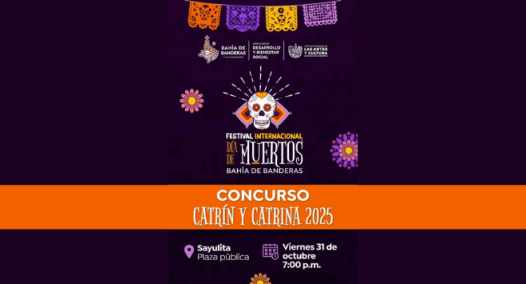 En el marco del Festival Internacional del Día de Muertos Bahía de Banderas 2025, el H. XII Ayuntamiento, que encabeza el alcalde Héctor Santana, a través del Instituto Municipal de las Artes y Cultura, en coordinación con la Dirección de Desarrollo y Bienestar Social, lanzó la convocatoria para participar en el Concurso de Catrín y Catrina 2025, que se llevará a cabo el próximo viernes 31 de octubre a las 7:00 p.m. en la plaza pública de Sayulita.