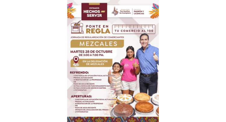 El Gobierno Municipal hace un llamado a los comerciantes de Mezcales y sus alrededores a acudir con su documentación completa, con el fin de aprovechar esta jornada que busca ofrecer un trámite ágil y accesible para todos los negocios del municipio.