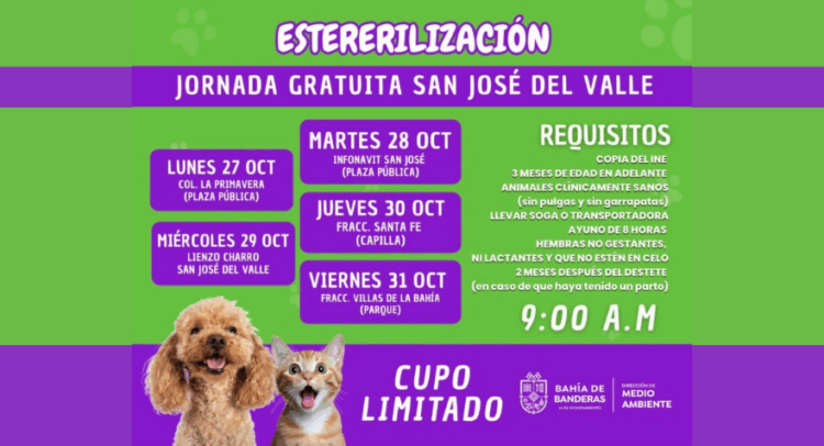 El Gobierno de Bahía de Banderas, que encabeza el alcalde Héctor Santana, a través de la Dirección de Medio Ambiente, realizará una Jornada Gratuita de Esterilización para perros y gatos en diversas sedes de San José del Valle, del lunes 27 al viernes 31 de octubre, a partir de las 9:00 a.m.