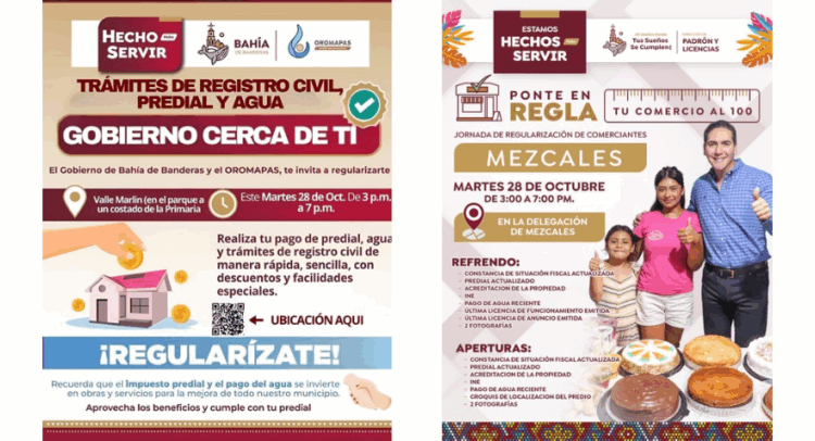 ¡Regularízate! Este martes 28 de octubre, el Gobierno de Bahía de Banderas se acerca a ti en la Delegación de Mezcales y en Valle Marlin. Aprovecha descuentos, trámites y facilidades para tu comercio. ¡No te lo pierdas!