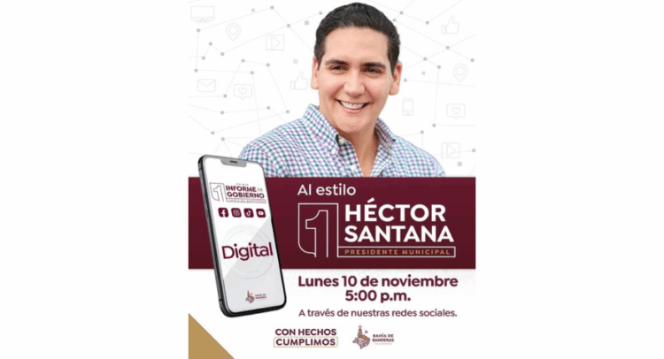 El presidente municipal de Bahía de Banderas, Héctor Javier Santana García, presentará este lunes 10 de noviembre a las 5:00 de la tarde su Primer Informe de Resultados, el cual será transmitido a través de las redes sociales oficiales del Ayuntamiento.