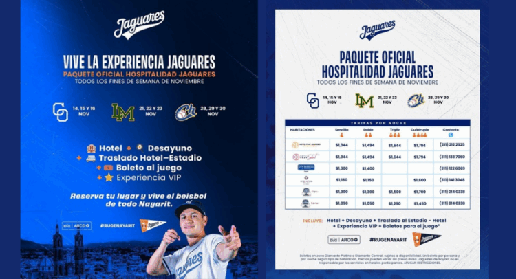 Los Jaguares de Nayarit en colaboración con diferentes hoteles de renombre en la capital nayarita se unen para ofrecer a los aficionados el Paquete Oficial Hospitalidad Jaguares, que estará vigente durante todos los fines de semana en casa del mes de noviembre.
