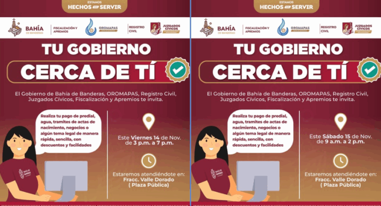 El Gobierno de Bahía de Banderas, a través de OROMAPAS, el Registro Civil, Juzgados Cívicos y la Dirección de Fiscalización y Apremios, extiende la invitación a la jornada “Tu Gobierno Cerca de Ti”, que se llevará a cabo este viernes 14 de noviembre en un horario de atención de 3:00 p.m. a 7:00 p.m., y el sábado 15 de noviembre en un horario de 9:00 a.m. a 2:00 p.m. en la plaza pública del fraccionamiento Valle Dorado.