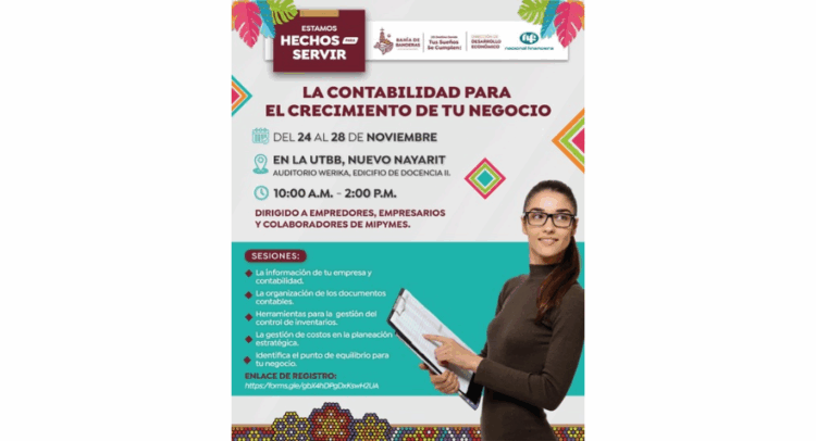 El Gobierno Municipal de Bahía de Banderas, a través de la Dirección de Desarrollo te invita a participar del 24 al 28 de noviembre en el taller «La Contabilidad para el crecimiento de tu negocio» qué está dirigido a emprendedores, empresarios y colaboradores de MIPYMES, esto con el objetivo de fortalecer los conocimientos en gestión contable. Esta capacitación se realizará en las instalaciones de la UTBB, en el Auditorio Werika ubicado en el Edificio de Docencia II, en un horario de 10:00 a. m. a 2:00 p. m.