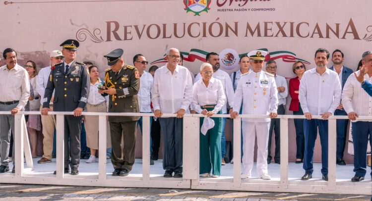 El gobernador del estado de Nayarit, Miguel Ángel Navarro Quintero, acompañado por su esposa, la presidenta del Sistema DIF Nayarit, doctora Beatriz Estrada Martínez, presenció el desfile conmemorativo por el CXV Aniversario de la Revolución Mexicana, realizado frente a Casa de Gobierno.