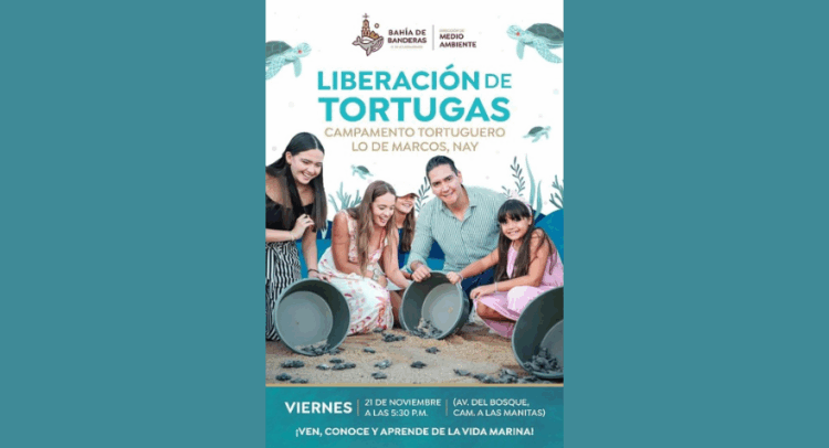El H. XII Ayuntamiento de Bahía de Banderas, que encabeza el presidente municipal Héctor Santana, a través de la Dirección de Medio Ambiente, invita a la ciudadanía a participar en la próxima Liberación de Tortugas que se llevará a cabo en el Campamento Tortuguero de Lo de Marcos.
