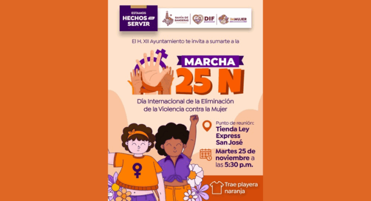 El H. XII Ayuntamiento de Bahía de Banderas, que encabeza el presidente municipal Héctor Santana, invita a todas y todos los habitantes del municipio a sumarse a la Marcha 25N, esto en el marco del Día Internacional de la Eliminación de la Violencia contra la Mujer. Esta marcha busca visibilizar la importancia de erradicar cualquier forma de violencia de género y promover entornos seguros para todas las mujeres y niñas del municipio.