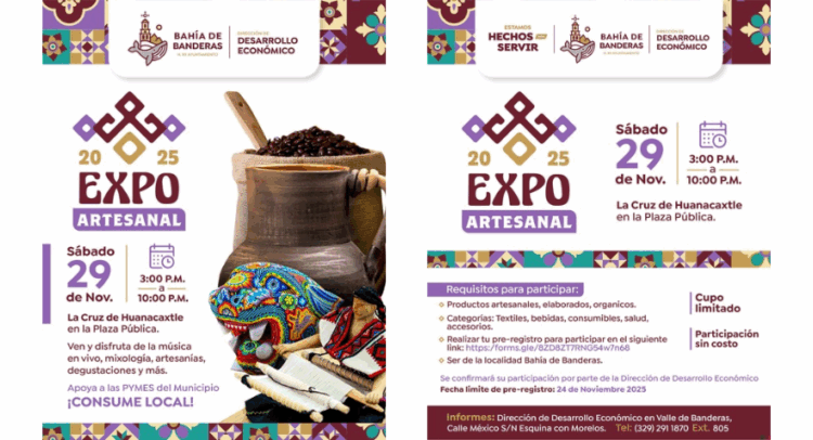 El Gobierno Municipal de Bahía de Banderas, que encabeza el presidente municipal Héctor Santana, a través de la Dirección de Desarrollo Económico, anuncia la realización de la Expo Artesanal 2025, que se llevará a cabo el próximo sábado 29 de noviembre, en un horario de 3:00 p.m. a 10:00 p.m., en la Plaza Pública de La Cruz de Huanacaxtle.